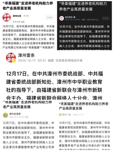 12月17日,“寻美福建”主题活动走进漳州多家养老机构。福建省新联会网络人士分会、漳州市新联会网络人士分会的网络代表人士第一时间响应号召,用镜头、文字与创意,全程记录老人们的笑容、照护团队的用心,以及漳州养老服务的温暖细节。