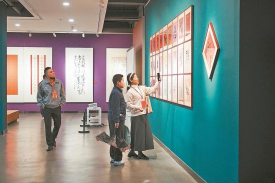 据了解,本次展览由福建省炎黄文化研究会、福文化研究院、省书法家协会和福州市文旅局共同主办。图为参观者在拍摄展品。
