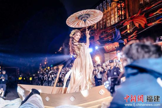 巡游中的00后抖音创作者陈楚念是福州本地人,他在海外留学时将布袋木偶戏等传统戏剧与现代机械舞融合,单条视频收获超500万点赞。作为非遗创新的代表,此次他身着融合簪花元素的服饰亮相千灯方阵,表现非遗风格机械舞,助力古老非遗焕发新生。