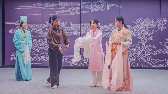 “同学们你们看,这个动作叫‘蝶双飞’。”从云手的弧度、台步的节奏,到甩袖的力道,再到眼神的流转……为了精准还原歌仔戏独特文化韵味,实践团队定期走进漳州市歌仔戏传承保护中心,在专业演员指导下学习经典唱腔、基础身段及简单戏段编排,深入感受歌仔戏的文化内涵。