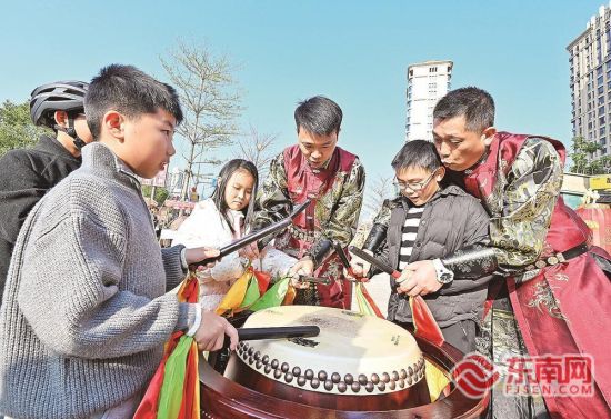 3月7日,在福州市仓山区梅岭观海广场,“太平鼓”非遗快闪表演活力开场,激昂鼓声吸引众多市民驻足。