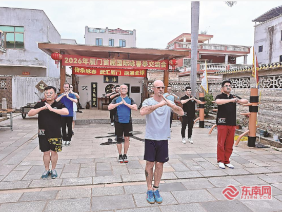 近日,2026年厦门首届国际咏春拳交流会在翔安举行,来自国内以及德国、瑞士、加拿大的咏春拳叶问系传人齐聚一堂,共同交流技法、体验中国文化。图为咏春拳门人正在习练武术套路。