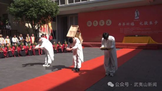 仪式上,数十名来自武夷山旅游职业中专学校的学子,身着古装、手执茶枝执礼。随后,朱子文化专家与朱子后裔、茶人朋友依次上前,礼敬“茶仙朱子”,致以深切缅怀与崇高敬意。仪式尾声,全场齐声高喊“开茶喽、福到喽”,尽显武夷茶人顺应天时、敬天惜茶的质朴情怀,寄托着对新茶丰收的美好祈愿。